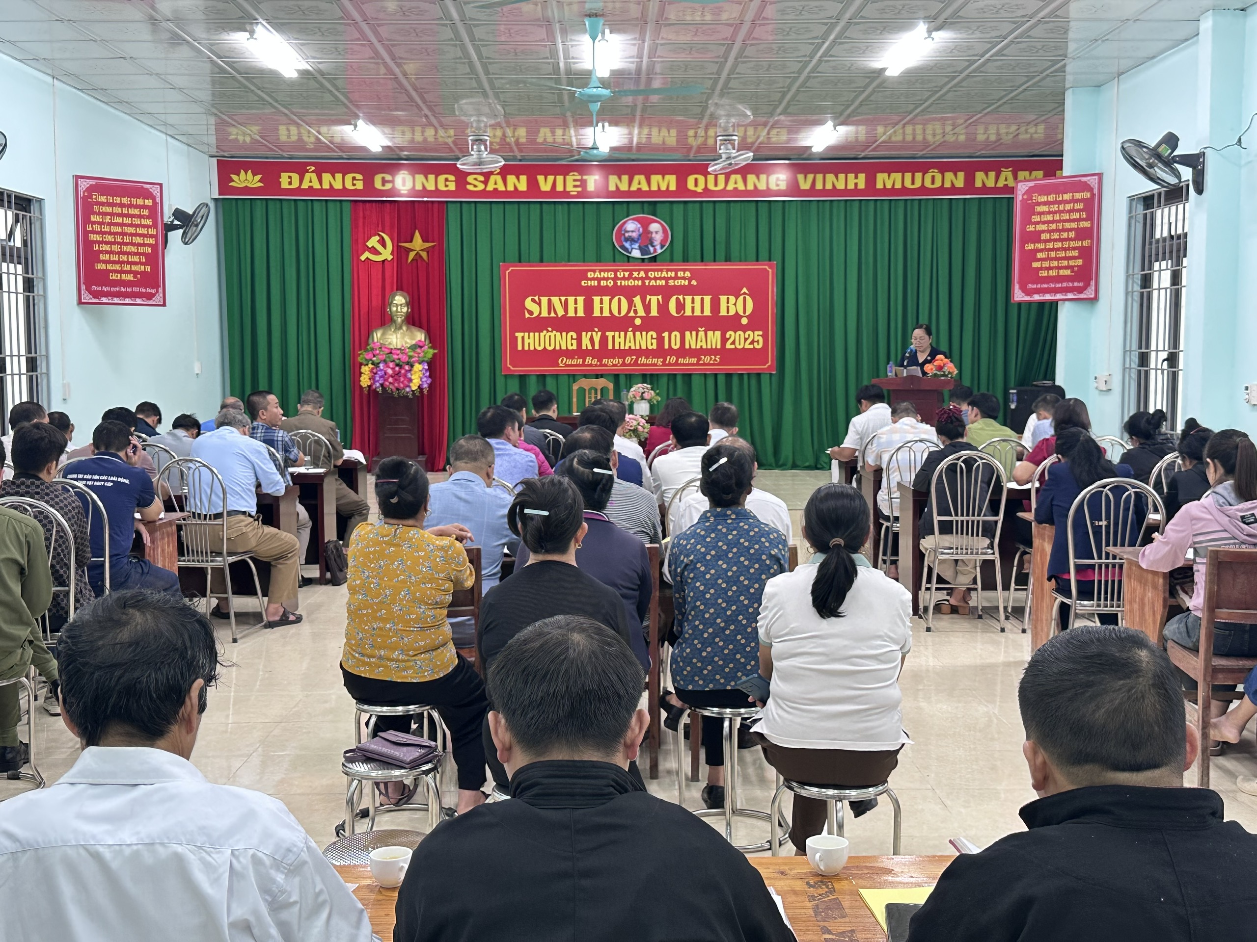 Sáng ngày 7/10/2025, Đảng ủy xã Quản Bạ tổ chức sinh hoạt chi bộ mẫu đối với chi bộ thôn Tam Sơn 4 (đây là chi bộ được Đảng ủy xã Quản Bạ chọn làm điểm để rút kinh nghiệm và nhân rộng trong toàn chi bộ trực thuộc Đảng ủy xã . Dự và chỉ đạo buổi sinh hoạt có đồng chí Viên Thị Mai Lan, Phó Bí thư Thường trực Đảng uỷ; các đồng chí Ủy viên Ban Thường vụ Đảng ủy xã, cùng Bí thư các Chi bộ trực thuộc trên địa bàn xã Quản Bạ và thị trấn Tam Sơn (cũ). Tham dự buổi sinh hoạt có 62/99 đảng viên trong chi bộ.