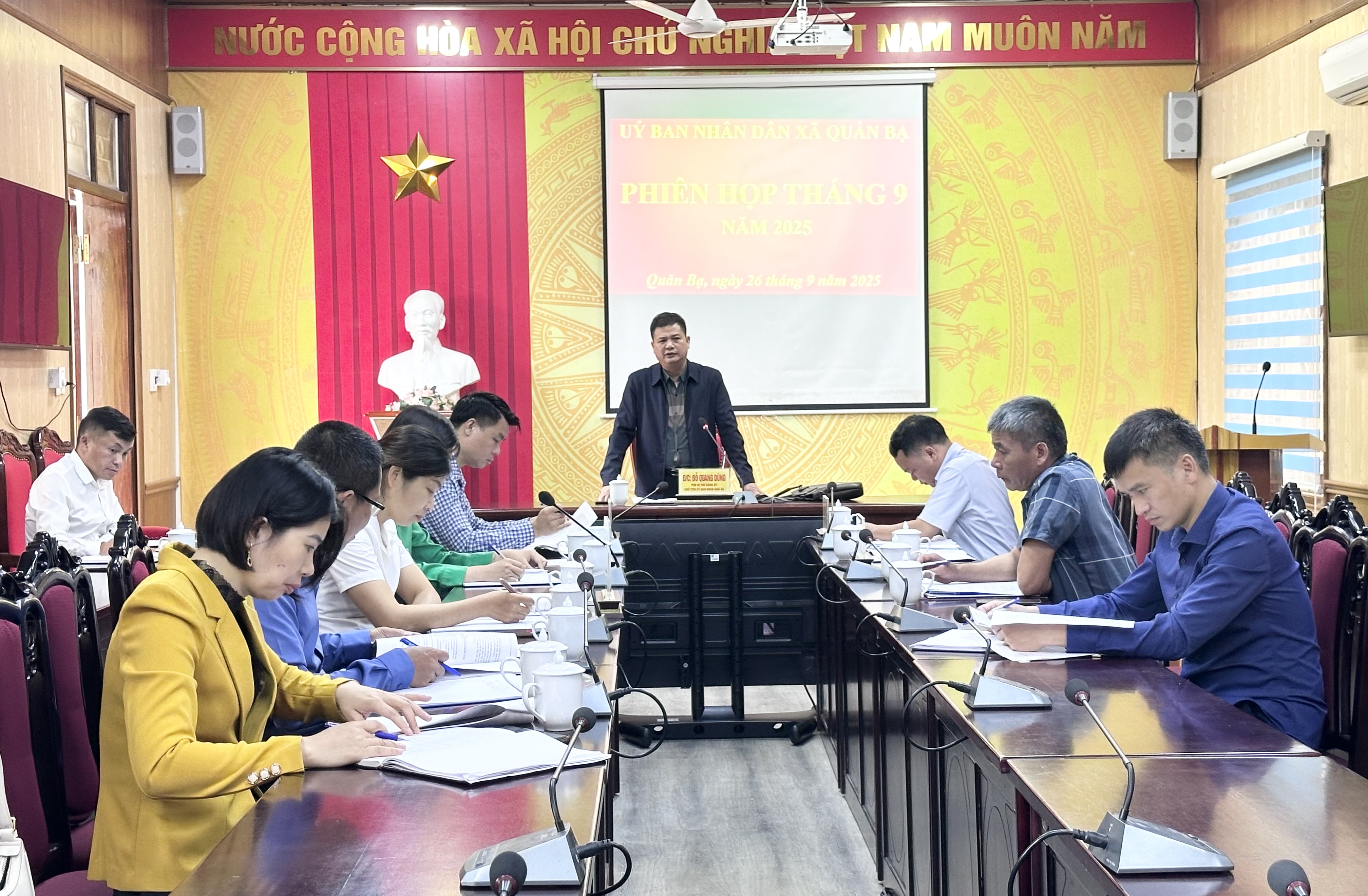 Sáng ngày 26 tháng 9 năm 2025, Ủy ban nhân dân xã Quản Bạ đã tổ chức phiên họp thường kỳ tháng 9 nhằm đánh giá tình hình thực hiện nhiệm vụ phát triển kinh tế - xã hội, quốc phòng - an ninh trong 9 tháng đầu năm và triển khai nhiệm vụ trọng tâm tháng 10 năm 2025. Đồng chí Đỗ Quang Dũng, Phó Bí thư Đảng uỷ, Chủ tịch UBND xã chủ trì phiên họp. Tham dự phiên họp có các đồng chí trong Thường trực UBND xã, thành viên UBND xã, trưởng các ban ngành và đại diện các đơn vị liên quan trên địa bàn.