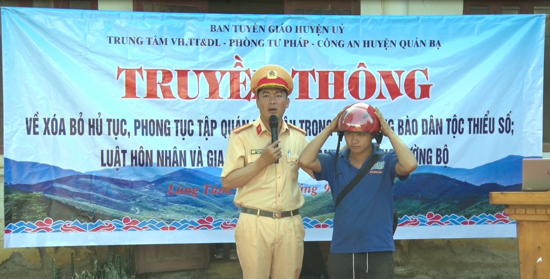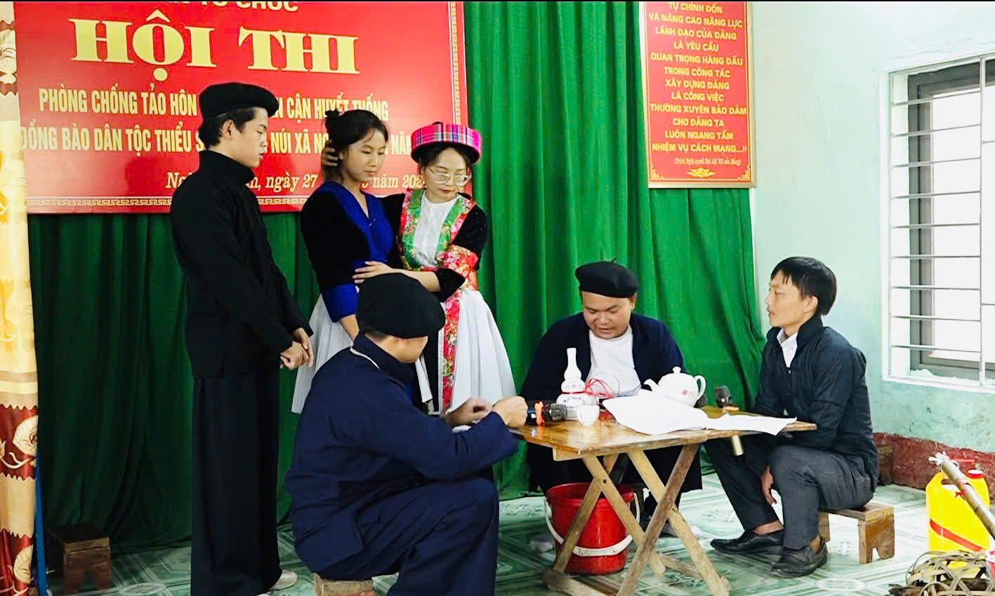 Vừa qua, Ban Dân vận Huyện ủy chủ trì phối hợp với Công an huyện, Phòng Tư pháp, Tòa án nhân dân huyện, Viện Kiểm sát nhân dân huyện, Phòng Giáo dục và Đào tạo, Hội Liên hiệp Phụ nữ huyện, Huyện đoàn, Trung tâm Văn hoá, Thông tin và Du lịch huyện, Chi cục Thi hành án dân sự huyện tổ chức tuyên truyền phòng chống tảo hôn bằng hình thức “Phiên tòa giả định” tại xã Tùng Vài xét xử tội giao cấu với người từ đủ 13 tuổi đến dưới 16 tuổi. Phiên toà được tổ chức vào ngày chợ phiên đã thu hút đông đảo đoàn viên, thanh niên và nhân dân đến xem.