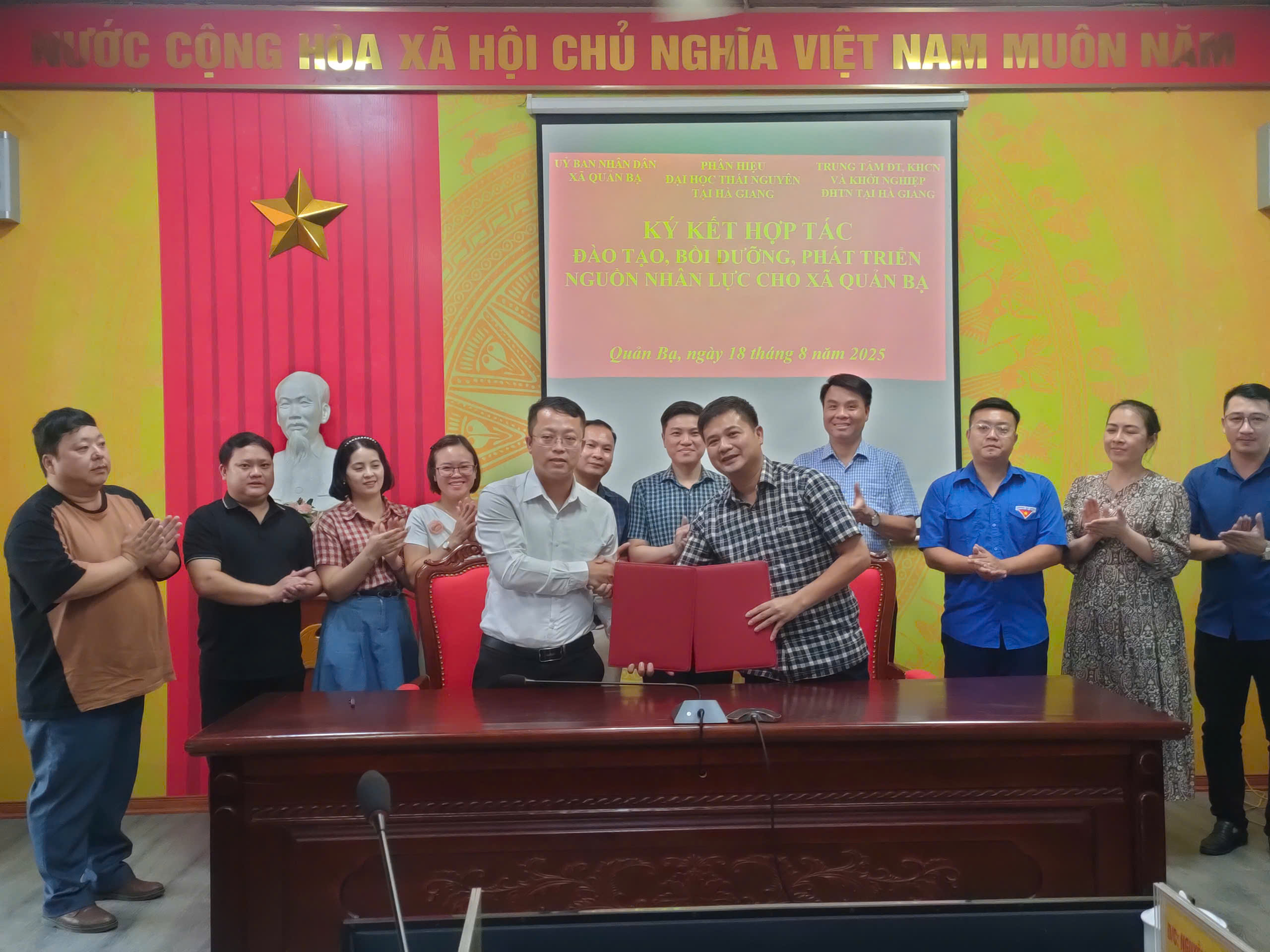 Chiều 18/8, UBND xã Quản Bạ phối hợp với Phân hiệu Đại học Thái nguyên tại Hà Giang và Trung tâm Đào tạo KHCN và khởi nghiệp ĐHTN tại Hà Giang tổ chức Lễ Ký kết hợp tác đào tạo, bồi dưỡng, phát triển nguồn nhân lực cho xã Quản Bạ. Dự buổi lễ về phía phân hiệu Đại học Thái nguyên tại Hà Giang có tiến sĩ Lục Quang Tấn - Giám đốc Phân hiệu ĐHTN tại tỉnh Hà Giang kiêm Giám đốc Trung tâm Đào tạo Khoa học, công nghệ và Khởi nghiệp ĐHTN tại tỉnh Hà Giang; Thạc sĩ Nguyễn Thái Hùng - Giám đốc Trung tâm ĐT,BD và PTNNL - Phân hiệu ĐHTN tại tỉnh Hà Giang kiêm nghiệm Trung tâm Đào tạo Khoa học, công nghệ và Khởi nghiệp ĐHTN tại tỉnh Hà Giang. Về phía xã Quản Bạ dự có đồng chí Nguyễn Hải Dương, Bí thư Đảng ủy xã, Chủ tịch HĐND xã; đồng chí Đỗ Quang Dũng, Phó Bí thư, Chủ tịch UBND xã; đồng chí Nguyễn Duy Huân, Ủy viên BTV, Phó Chủ tịch UBND xã; Thường trực Ủy ban MTTQ Việt Nam xã; Lãnh đạo phòng ban, chuyên môn liên quan; Lãnh đạo 9/9 đơn vị trường học trên địa bàn xã Quản Bạ.